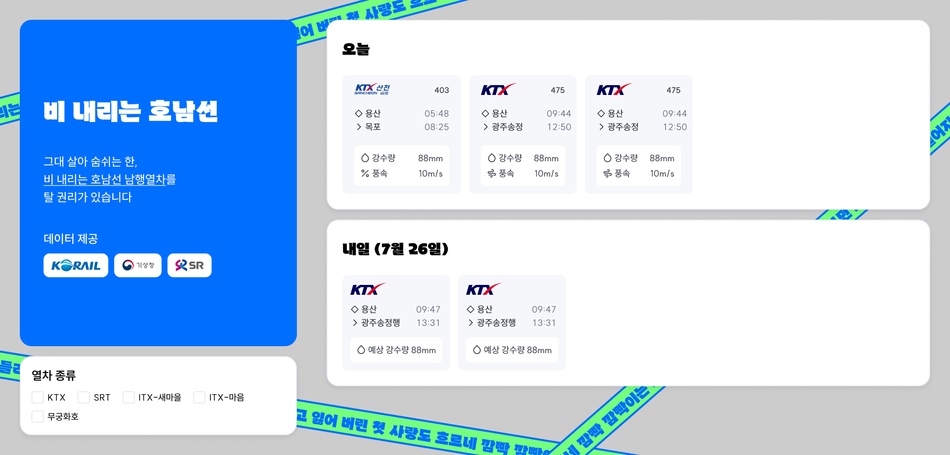 커밋 이력을 보니 일주일에 걸려서 만들었다고 되어있다. 만들어서 긱뉴스(비 내리는 호남선 | GeekNews)와 디스콰이엇(비 내리는 호남선 | Disquiet*)에 올렸는데, 사람들이 좋아해줘서 참 기뻤다..^^