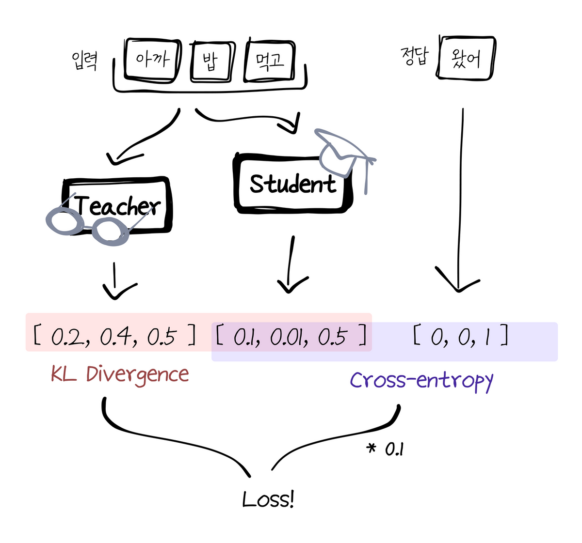 Teacher 모델의 출력을 Student에 학습시키기 위해서는, Teacher 모델의 출력을 Softmax에 넣어서 전체 사전에서 각 토큰의 등장 가능성으로 변환해야 합니다.