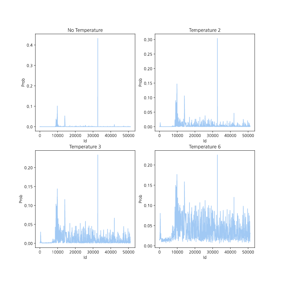 위는 각각 Temperature가 없을 때, 2일 때, 3일 때, 6일 때의 Softmax 결과(토큰별 등장확률)를 시각화한 그래프입니다. Temperature가 높아질 수록 확률의 편차가 줄어듭니다. 높았던 확률은 낮아지고 낮았던 확률은 높아져서, 모든 토큰의 등장 확률이 강조됩니다.