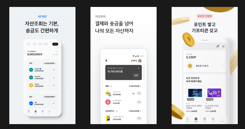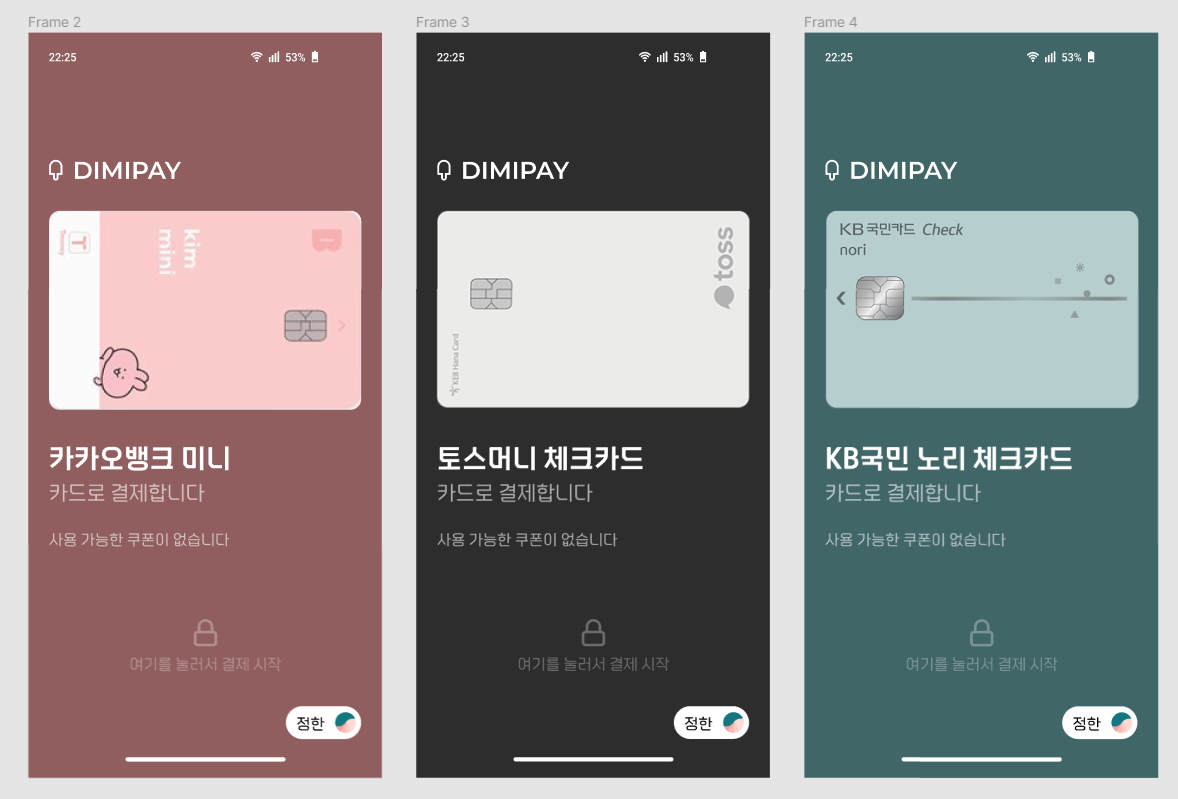 각각 삼성금융네트웍스(모니모), KB국민카드(KB페이), 온잇(페이웨이)의 앱 디자인입니다. 정말.. “토스스럽다”라는 말이 딱 어울리는 디자인이에요. 저런 앱들을 보면서, 다채로운 디자인을 해보고싶다는 생각이 들었어요. 맨 위에 첨부한 첫 디자인을 보고 회의를 하면서 기획을 한 뒤에 이런 디자인이 나왔어요.